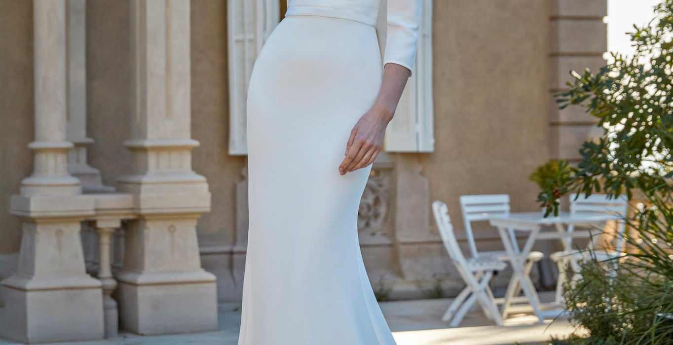 En sofistikerad brudklänning i crepe och satin med en figurnära mermaid-silhuett som smickrar kroppen. Den kvadratiska urringningen och de trekvarts-långa ärmarna skapar en balanserad och elegant look med modern karaktär. En perfekt klänning för bruden som söker tidlös skönhet med en samtida touch.